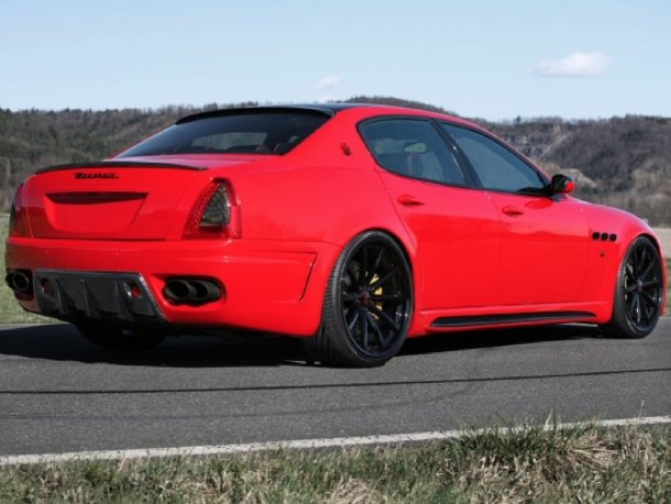 Bereits seit 2003 ist der aktuelle Maserati Quattroporte im Modellprogramm der Italiener vertreten. Eine recht lange Zeit im Vergleich zur direkten Konkurrenz. Interessanterweise ist zum einen das Design bis heute keinesfalls veraltet und zum anderen hat bislang kaum ein Tuner Hand an die sportliche Limousine gelegt. Letzteres wird nun von CDC-Performance aus Neuenmarkt in der Oberpfalz geändert. Hierzu werden dem Italiener neue, auffällig geschnittene Kleider angelegt, durch die das Fahrzeug bulliger und kräftiger wirkt. Alles beginnt an der Front mit einer neu gestalteten Schürze, die neben drei Lufteinlässen auch senkrecht stehende Tagfahr-LEDs enthält. Sportliche Seitenschwellerverkleidungen, sowie ein Dachspoiler, eine Heckabrisskante auf dem Kofferraumdeckel und ein Diffusoreinsatz in der Heckschürze, die gemeinsam für Abtrieb sorgen, runden den neuen Auftritt des CDC Quattroporte ab. Spoiler, Abrisskante und Diffusor zeigen sich in Sichtcarbon.