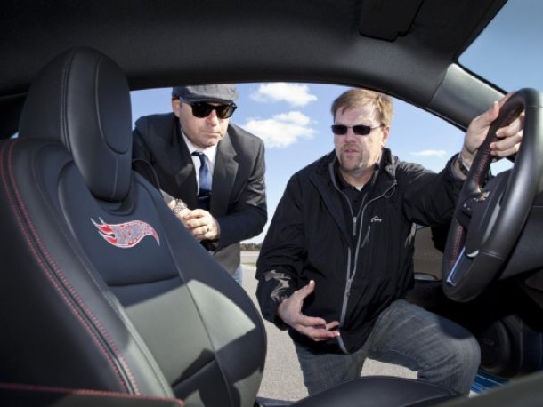 Chevrolets Marketing Vizepräsident Chris Perry (r.) und Hot Wheels Vizepräsident der Kreativabteilung Felix Holst (l.) präsentieren stolz das gemeinsame Produkt.