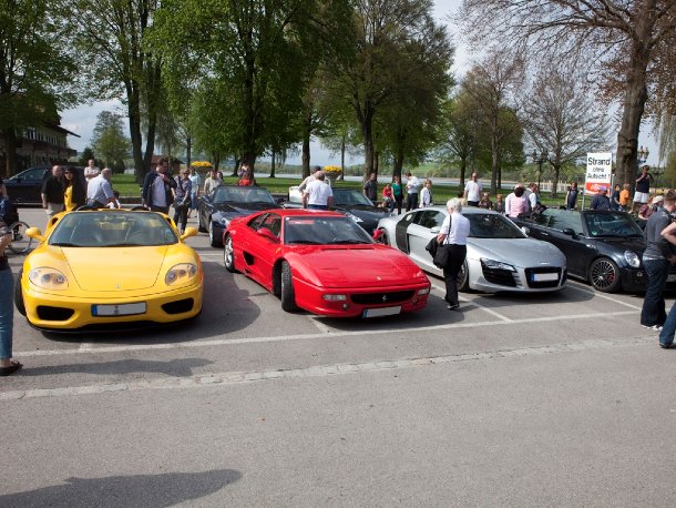 Der erste Stop diente neben der leiblichen Stärkung auch dazu, dass sich die Teilnehmer kennenlernen konnten. Obwohl einige Teilnehmer bereits zum dritten Mal dabei waren, gab es doch Einige, die zum ersten Mal an einem Carpassion.com-Treffen teilnahmen und deshalb einiges an Bekanntschaften aufzuholen hatten. Irgendwann war jede Hand geschüttelt und jedes Gesicht begrüßt. So zog die Karawane bestens gelaunt weiter, angeführt vom Veranstalter in seinem schwarzen Ferrari F360 Spider. Die Route führte wieder zurück nach Bayern, genauer gesagt zum Waginger See.