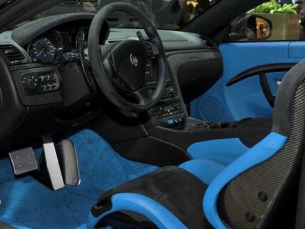 Auch der Innenraum erhält auf Wunsch eine Aufwertung. Beim Präsentationsfahrzeug wurden die Sportschalensitze aus dem MC Stradale verbaut und anschließend das gesamte Interieur mit einem Mix aus blauem Leder und schwarzem Alcantara bezogen. Blaue Kontrastziernähte und Carbondekorleisten runden das sportlich-elegante Arbeitszimmer des Maserati ab. Dazu gibt es Aluminiumpedale. Farblich passend dazu wurde die Karosserie im Farbton „Malta Blau metallic“ lackiert. DMC benennt den Maserati GranTurismo nach vollendeter Operation auch gleich um: Sovrano heißt er nun, zu deutsch: der Herrscher oder der Souveräne.