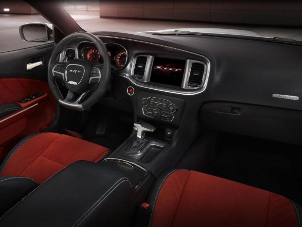 Das Interieur des Charger SRT Hellcat zeigt sich zweifarbig in schwarzem Nappaleder und rotem Alcantara.