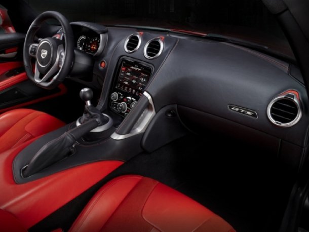 Neben der normalen SRT Viper gibt es gegen Aufpreis die Dodge SRT Viper GTS, die sich durch ein zweistufig elektronisch einstellbares Fahrwerk und eine Voll-Leder-Ausstattung auszeichnet. So ausgestattet zeichnet sich das Interieur zweifarbig in rot und schwarz aus. Durch rote Ziernähte wird ein zusätzlicher Kontrast erreicht. Aluminium- und Chrom-Applikationen runden die Optik ab. In der Mittelkonsole zeigt sich, dass die SRT Viper das 21. Jahrhundert erreicht hat: Ein 8,4 Zoll großes Touchscreen-Display dient als Anzeige für das Navigations-System, das Audiosystem und alle weiteren Einstellmöglichkeiten für den Fahrzeugkomfort. Auch die drei Rundinstrumente hinter dem Lenkrad stellen sich bei genauerer Betrachtung als digital heraus. In der Mitte des Drehzahlmessers können wichtige Infos eingeblendet werden, während beim erreichen des roten Drehzahlbereiches das Wappentier zum Schaltvorgang ermahnt, bevor sich die Schlange selbst die Zähne ausbeißt. Geschaltet wird in der neuen SRT Viper auf konventionelle Weise, also manuell. Sechs Gänge stehen dabei für den Vortrieb zur Verfügung.