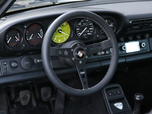 Das Interieur bleibt wahlweise original erhalten oder kann in einer sehr spartanischen Variante geordert werden, die an frühe 911er Rennfahrzeuge erinnert. Allerdings sind die verbauten Komponenten wie Sitzschalen und Vierpunktgurte natürlich auf aktuellstem Stand und verfügen lediglich über ein klassisches Aussehen. Hinter Fahrer und Beifahrer kann ein Überrollkäfig verbaut werden, der wahlweise in Wagenfarbe lackiert wird. Hinter dem Momo-Sportlenkrad finden sich fünf Rundinstrumente mit dem Drehzahlmesser klassisch in der mittleren Position.