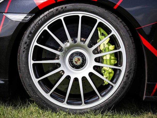 Optisch hält sich Edo Competition beim Porsche 991 Turbo S sehr zurück. Lediglich 20 Zoll große Vielspeichen-Schmiederäder, die durch eine Tieferlegung um rund 30 Millimeter besser zur Geltung kommen sowie giftgrün lackierte Bremssättel unterscheiden den Wagen vom Serienbruder. Und natürlich das auffolierte Stäbchenmuster nach Kundenwunsch. Am Heck finden sich zudem die Endrohre der neu verbauten Edelstahlabgasanlage.