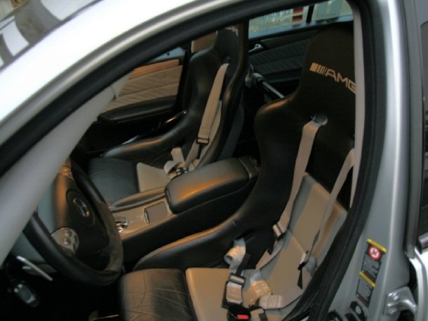 Von außen handelt es sich auf den ersten Blick unzweifelhaft um eine C-Klasse der Baureihe W203, wie sie zigfach im normalen Straßenverkehr zu sehen ist. OK, da sind am Heck die vier ovalen Auspuffendrohre und eine kleine Abrisskante auf der Kofferraumklappe, demnach ist es wohl die späte AMG-Variante mit dem 5,5 Liter V8-Motor. Doch auch für Experten etwas unerklärlicher ist die Frontschürze. Sie weist zwar mit ihren großen Kühlluftöffnungen und den integrierten Nebelscheinwerfern ebenfalls auf die Affalterbacher Herkunft hin, aber die Luftauslässe vor den Vorderrädern gab es so nicht im normalen Programm. Sie geben den Ausschlag dafür, dass es sich nicht um ein x-beliebiges Fahrzeug von der Stange handelt.
