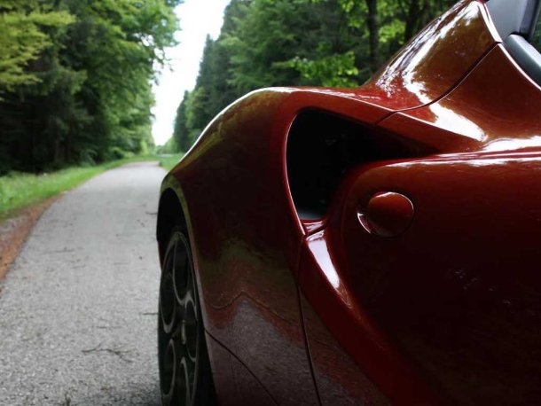 Weil auch dieses Auto nur aus Italien kommen kann. In einem hell brennenden Rosso Competizione steht der flache Renner stolz auf der Straße, wie die Skulptur eines Sportwagens. Hier gibt es keine einfachen, glatten Flächen sondern fast ausschließlich Rundungen, Wölbungen und Kurven. Die Form beansprucht eindrucksvoll Exotenstatus, vor allem wenn man sich die mächtige Breite verdeutlicht. Mit 1.868 Millimetern ist der kleine Italiener deutlich ausladender, als ein Porsche Cayman oder Lotus Evora.