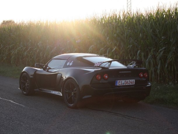 Das Design ist für Kenner der Marke selbsterklärend. Mit den riesigen Einlässen vorne für die 3 Kühler nimmt man der schwarzen Flunder ihr typisches Happy Face aber nicht mehr richtig ab. Die Pilotenkapsel hinter den markanten Kotflügeln im Gruppe C Stil ist Elise-Fahrern ebenso geläufig, wie die Türen und der Großteil des Interieurs. Erst hinter den Sitzen geht es mächtiger in die Breite als gewohnt. Trotzdem geht die Exige immer noch als ausgesprochen kompakter PKW durch. Die Parkplatzsuche ist jedenfalls keine besonders große Herausforderung.