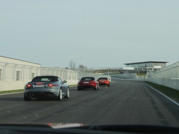 Zunächst einmal hieß es Platz nehmen. Man hatte ausreichend Zeit, um sich mit dem fein verarbeiteten Cockpit des F-Type zu beschäftigen. Alle Bedienknöpfe sind logisch angeordnet und man findet sich selbst als Jaguar-Novize schnell zurecht. Als nächstes hieß es logischerweise Dach auf – selbstverständlich elektrisch – und Fenster runter. Nach einer kurzen Instruktion ging es los, endlich durften wir den verheißungsvollen Knopf „Engine Start“ drücken. Zunächst ging es hinter dem Führungsfahrzeug her und die erreichten Landstraßen- und Kurventempi waren durchaus beeindruckend. Das Fahrzeug liegt absolut stabil und lässt sich trotzt abgeschalteter Fahrhilfen nicht aus der Ruhe bringen. Für die zweite Landstraßenrunde hieß es Fahrzeugtausch. Wer auf der ersten Runde im Sechszylinder saß, nahm nun im Achtender Platz und umgekehrt. Wir fuhren nun direkt hintereinander und während Oliver Kühlein den V8 S als Vorausfahrzeug pilotierte steuerte Matthias Kierse direkt dahinter den V6 S. Beeindruckend war dies insofern, da es dem deutlich stärker motorisierten Fahrzeug nicht gelang den schwächeren Wagen deutlich zu distanzieren. So hielt sich der kleinere F-Type immer im direkten Windschatten des Vorausfahrenden. Der Eindruck, dass der V8 nicht zwingend notwendig ist festigte sich dann auch später auf der Rennstrecke. Beim Blick auf die offiziellen Fahrwerte bestätigt er sich ebenso: 4,9 Sekunden auf Tempo 100 im V6, 4,3 im V8. Das Spitzentempo von 275 zu 300 km/h konnte die größere Motorisierung auf der kurvigen Landstraße logischerweise nicht ausspielen.