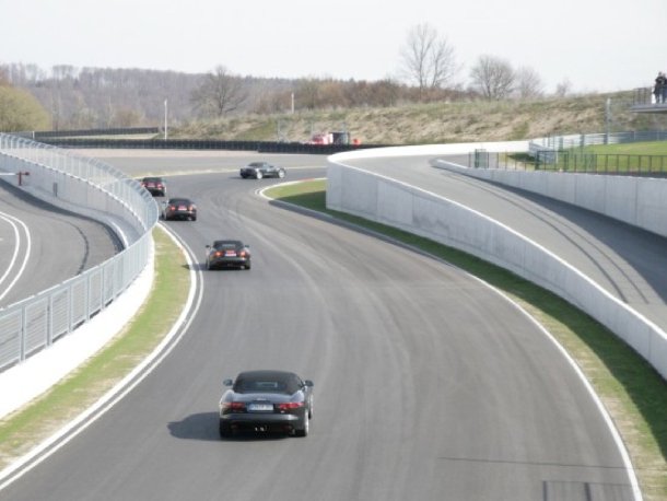 Nachdem sich die Teilnehmer auf der Landstraße ausgetobt hatten ging es zur nächsten Station auf die Teststrecke Bilster Berg. Man verteilte sich jeweils zu zweit auf acht bereitstehende Fahrzeuge und nahm in Vierergruppen hinter einem Instruktor die für alle noch unbekannte Strecke erstmals in Augenschein. Durch gezielte Hinweise zur Ideallinie und gut platzierte Pylonen, die den Einlenk-, Scheitel- und Ausgangspunkt der Kurven markierten, fassten die meisten Fahrer schnell Mut, um zügig ihre Runden zu drehen. Hier ging es dann selbstverständlich noch einmal ein ganzes Stück dynamischer zu, als vorher auf der Landstraße und die Teilnehmer durften selbst erfahren, wie gut der F-Type ausbalanciert ist und wie präzise er sich dirigieren lässt. Die Strecke des Bilster Berges tat ein Übriges dazu den Anwesenden ein breites Grinsen auf die Gesichter zu zaubern.