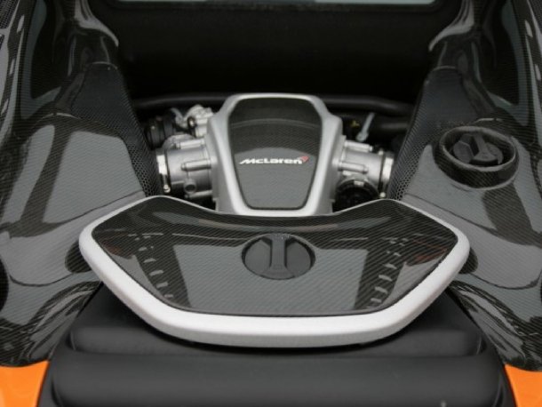 Dieses Cockpit befand sich in einem Volcano Orange lackierten Spider, der, wie die anderen drei Fahrzeuge, direkt auf McLaren in Großbritannien zugelassen war. Als Testwagen konnte man hier natürlich auf eine reichhaltige Ausstattungsliste blicken, die neben den Carbon Ceramic Bremsen auch Sichtcarbon am Frontsplitter, den Außenspiegelgehäusen, den seitlichen Luftleitblechen an den Lufteinlassöffnungen, der Motorverkleidung und dem Diffusor umfasste. Auch das Interieur zeigte viel von der leichtgewichtigen Kohlefaser, die beim Bau des Wagens exzessiv genutzt wird, um das Gewicht so gering wie möglich zu halten. Fahrer und Beifahrer nehmen in einer Mono-Zelle Platz, die derartig verwindungssteif ist, dass für den Spider keine Änderungen gegenüber dem Coupé erfolgen müssen. Das Mehrgewicht von 40 Kilogramm rührt einzig und allein vom Mechanismus des Klappverdecks her. Dieses birgt jedoch neben der versenkbaren Rückscheibe einen weiteren Vorteil zum Coupé: Wenn das Verdeck geschlossen ist, kann der Verdeckkasten als zusätzlicher Kofferraum genutzt werden. Damit ist der MP4-12C Spider wohl das einzige Cabrio mit mehr Stauraum als das dazugehörige Coupé.