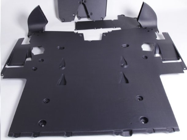 Im technisch wirkenden matten Karbonlook präsentiert sich der Capristo Ferrari 458 Unterboden, der die Originalteile aus Kunststoff ersetzt. Die Unterbodenverkleidung in Vollkarbon bringt eine Gewichtsersparnis von knapp sieben Kilogramm und erfüllt dabei die gleichen Ansprüche wie die werksseitige Verkleidung. Auch hier besteht Capristo auf eine Fertigung mit den original Aufhängepunkten, um einen einfachen Austausch möglich zu machen. Formschlüssig zu allen anderen Teilen überzeugt auch die neue Unterbodenverkleidung mit der vollen Funktionalität. Dazu kommen dann die passend in Karbon matt gehaltenen Radhausverkleidungen für alle vier Räder. Auch hier lassen sich nochmals fast sieben Kilogramm im Vergleich zu den Originalteilen einsparen.