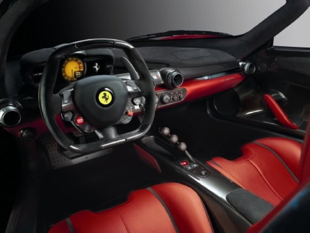 Dazu zählen auch die Passagiere, deren Sitzschalen fest im Monocoque eingebacken sind. Der Fahrersitz wird bei der Bestellung des Fahrzeugs an die Körperformen des neuen Besitzers angepasst. Anstatt den Sitz zu verschieben, lassen sich die Pedalerie und die Lenksäule so verstellen, dass jeder Fahrer eine bequeme Fahrposition finden kann. Dies ist bei einer Gesamtleistung von 708 kW/963 PS und mehr als 900 Newtonmetern Drehmoment auch bitter nötig, wenn man den Wagen nicht unfreiwillig kaltverformen möchte. 800 der 963 Pferdchen entstammen einem 6,3 Liter großen V12-Saugmotor, dessen roter Drehzahlbereich bei 9.250 Umdrehungen pro Minute beginnt. Er wird mit zwei zusammen 163 PS starken Elektromotoren kombiniert, die wie in der Formel 1 als KERS-System arbeiten, also per Knopfdruck ihre Leistung ins Spiel bringen und den LaFerrari zusätzlich beschleunigen. Die dazugehörigen Batterien sind so tief wie möglich im Fahrzeug verbaut und bringen lediglich 60 Kilogramm auf die Waage.