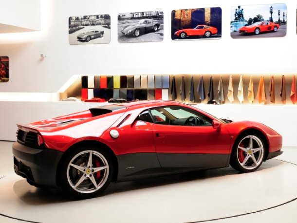 Speziell in der Heckgestaltung wird die optische Verwandtschaft zum Berlinetta Boxer deutlich. Unterm Blech steckt die Technik des 570 PS starken Ferrari 458 Italia.