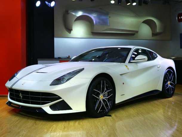 Der Ferrari F12berlinetta Polo Edition erinnert an den beliebten Ballsport, der vom Pferd aus betrieben wird. Sein Lack in Bianco Italia Opaco wird von blauen Streifen ergänzt.