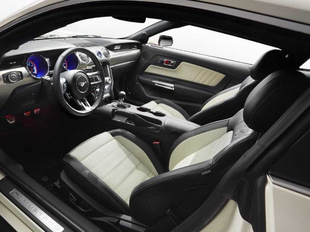 Auch das Interieur wird in bestimmten Details anders als bei normalen Mustangs gestaltet. So erhält zum Beispiel das Aluminiumdekor, das sich über das gesamte Armaturenbrett zieht, eine andere Oberflächenbehandlung. Oberhalb vom Handschuhfach deutet zudem eine Plakette mit durchlaufender Nummerierung auf die Besonderheit der 50 Year Limited Edition hin. Sitze und Türpaneele erhalten Bicolor-Leder in Schwarz und Cashmere-Beige. Dazu ziehen sich Ziernähte in Cashmere-Beige über Sitze, Lenkrad, Türen, Mitteltunnel und Armaturenbrett. In die Rückenlehnen ist das symbolische laufende Pferd und der Schriftzug „50 Years“ eingeprägt.