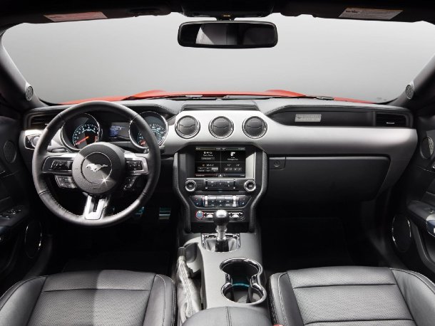 Auch innen orientiert sich der neue Ford Mustang an seinem legendären Vorbild, verbindet diese Optik jedoch mit neuesten Fahrer-Assistenzsystemen. So kann der Fahrer je nach gewählter Route und dort vorhandenem Straßenzustand über Schalter an der Mittelkonsole die Kennlinien von Lenkung, Federung, Gaspedal und Getriebe, sowie den Wirkungsgrad der Stabilitätskontrolle einstellen. In Kombination mit dem manuellen Getriebe werden die neuen Mustangs mit einer serienmäßigen Launch Control ausgeliefert, die dem Fahrer perfekte Ampelstarts erlauben. Das Entertainment-System SYNC mit Sprachbedienung und Touchscreen-Display lässt sich auf Wunsch um ein Navigationssystem und eine Premium-Sound-Anlage mit 12 Lautsprechern erweitern.