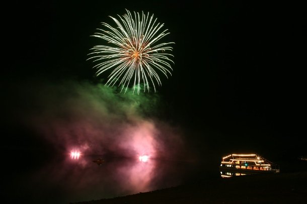 Pünktlich um 22:30 Uhr hörten wir auf einmal unser eigenes Motorendröhnen, welches Tony wohl am frühen Nachmittag hatte aufnehmen lassen. Und mitten hinein in diese für uns Teilnehmer wundervolle Geräuschkulisse zündete ein offenbar auf dem See installiertes Feuerwerk.
