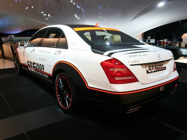 Im oberen Stockwerk fand sich das neue ESF Concept-Fahrzeug, ein Beweis für die umfassende Unfallforschung bei Mercedes-Benz. Anhand dieses Forschungsautos werden Sicherheitssysteme getestet, die eventuell in naher oder ferner Zukunft in den Serienfahrzeugen zu finden sein werden. Auch die B-Klasse mit Brennstoffzelle wurde im oberen Rundgang präsentiert. Dieses Fahrzeug wird in Kürze zu den Händlern rollen und verbraucht 0,0 Liter Benzin. Mercedes hauseigener Veredelungsbetrieb Designo ließ es sich nicht nehmen, einige Fahrzeuge mit erweitertem Ausstattungsumfang zu präsentieren. So fanden sich ein CL 4matic, ein SL, ein SLK und eine S-Klasse mit besonderen Lackierungen und einem Interieur in Sonderfarben und, im Falle der S-Klasse, mit absoluter Vollausstattung in Wunschoptik. Bereits im Foyer wurde man durch eine Übersicht von modernen und klassischen Mercedes-Fahrzeugen begrüßt, die nebeneinandergestellt den jeweiligen Brückenschlag von der Tradition in die Moderne verdeutlichen sollten. So fand sich das erste Automobil von Carl Benz neben dem Konzeptfahrzeug F Cell Roadster und der 300 SLR Rennsportwagen von 1955 stand neben seinem modernen Urenkel, dem SLR Stirling Moss, von dem nur 75 Stück entstehen sollen.