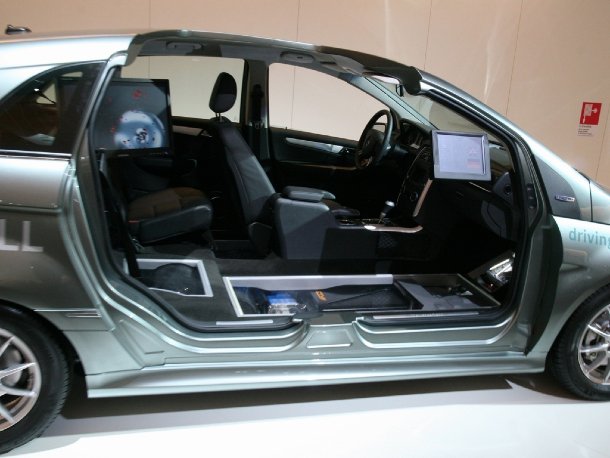 Im oberen Stockwerk fand sich das neue ESF Concept-Fahrzeug, ein Beweis für die umfassende Unfallforschung bei Mercedes-Benz. Anhand dieses Forschungsautos werden Sicherheitssysteme getestet, die eventuell in naher oder ferner Zukunft in den Serienfahrzeugen zu finden sein werden. Auch die B-Klasse mit Brennstoffzelle wurde im oberen Rundgang präsentiert. Dieses Fahrzeug wird in Kürze zu den Händlern rollen und verbraucht 0,0 Liter Benzin. Mercedes hauseigener Veredelungsbetrieb Designo ließ es sich nicht nehmen, einige Fahrzeuge mit erweitertem Ausstattungsumfang zu präsentieren. So fanden sich ein CL 4matic, ein SL, ein SLK und eine S-Klasse mit besonderen Lackierungen und einem Interieur in Sonderfarben und, im Falle der S-Klasse, mit absoluter Vollausstattung in Wunschoptik. Bereits im Foyer wurde man durch eine Übersicht von modernen und klassischen Mercedes-Fahrzeugen begrüßt, die nebeneinandergestellt den jeweiligen Brückenschlag von der Tradition in die Moderne verdeutlichen sollten. So fand sich das erste Automobil von Carl Benz neben dem Konzeptfahrzeug F Cell Roadster und der 300 SLR Rennsportwagen von 1955 stand neben seinem modernen Urenkel, dem SLR Stirling Moss, von dem nur 75 Stück entstehen sollen.