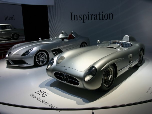 Im oberen Stockwerk fand sich das neue ESF Concept-Fahrzeug, ein Beweis für die umfassende Unfallforschung bei Mercedes-Benz. Anhand dieses Forschungsautos werden Sicherheitssysteme getestet, die eventuell in naher oder ferner Zukunft in den Serienfahrzeugen zu finden sein werden. Auch die B-Klasse mit Brennstoffzelle wurde im oberen Rundgang präsentiert. Dieses Fahrzeug wird in Kürze zu den Händlern rollen und verbraucht 0,0 Liter Benzin. Mercedes hauseigener Veredelungsbetrieb Designo ließ es sich nicht nehmen, einige Fahrzeuge mit erweitertem Ausstattungsumfang zu präsentieren. So fanden sich ein CL 4matic, ein SL, ein SLK und eine S-Klasse mit besonderen Lackierungen und einem Interieur in Sonderfarben und, im Falle der S-Klasse, mit absoluter Vollausstattung in Wunschoptik. Bereits im Foyer wurde man durch eine Übersicht von modernen und klassischen Mercedes-Fahrzeugen begrüßt, die nebeneinandergestellt den jeweiligen Brückenschlag von der Tradition in die Moderne verdeutlichen sollten. So fand sich das erste Automobil von Carl Benz neben dem Konzeptfahrzeug F Cell Roadster und der 300 SLR Rennsportwagen von 1955 stand neben seinem modernen Urenkel, dem SLR Stirling Moss, von dem nur 75 Stück entstehen sollen.