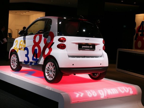 Auch beim Kleinstwagenhersteller Smart stand die IAA 2009 unter dem Ökobanner. Neben der Präsentation des neuen Smart Electric Drive stand die komplette Flotte der angebotenen Fahrzeuge als lange Reihe in der Halle, jeweils mit Aufdruck, wie hoch CO²-Ausstoß und Treibstoffverbrauch beim jeweiligen Modell sind. Je weiter man in Fahrtrichtung der Fahrzeuge ging, umso kleiner wurden diese Zahlen. Als einzige Ausnahme des Ökowahns stand ein weißer Brabus Smart mit auf dem Stand, der aufzeigt, dass man die Winzlinge auch optisch und technisch ein wenig sportlicher machen kann.