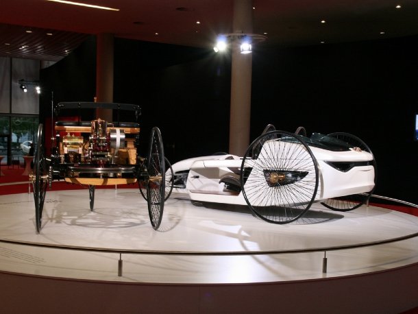 Im oberen Stockwerk fand sich das neue ESF Concept-Fahrzeug, ein Beweis für die umfassende Unfallforschung bei Mercedes-Benz. Anhand dieses Forschungsautos werden Sicherheitssysteme getestet, die eventuell in naher oder ferner Zukunft in den Serienfahrzeugen zu finden sein werden. Auch die B-Klasse mit Brennstoffzelle wurde im oberen Rundgang präsentiert. Dieses Fahrzeug wird in Kürze zu den Händlern rollen und verbraucht 0,0 Liter Benzin. Mercedes hauseigener Veredelungsbetrieb Designo ließ es sich nicht nehmen, einige Fahrzeuge mit erweitertem Ausstattungsumfang zu präsentieren. So fanden sich ein CL 4matic, ein SL, ein SLK und eine S-Klasse mit besonderen Lackierungen und einem Interieur in Sonderfarben und, im Falle der S-Klasse, mit absoluter Vollausstattung in Wunschoptik. Bereits im Foyer wurde man durch eine Übersicht von modernen und klassischen Mercedes-Fahrzeugen begrüßt, die nebeneinandergestellt den jeweiligen Brückenschlag von der Tradition in die Moderne verdeutlichen sollten. So fand sich das erste Automobil von Carl Benz neben dem Konzeptfahrzeug F Cell Roadster und der 300 SLR Rennsportwagen von 1955 stand neben seinem modernen Urenkel, dem SLR Stirling Moss, von dem nur 75 Stück entstehen sollen.