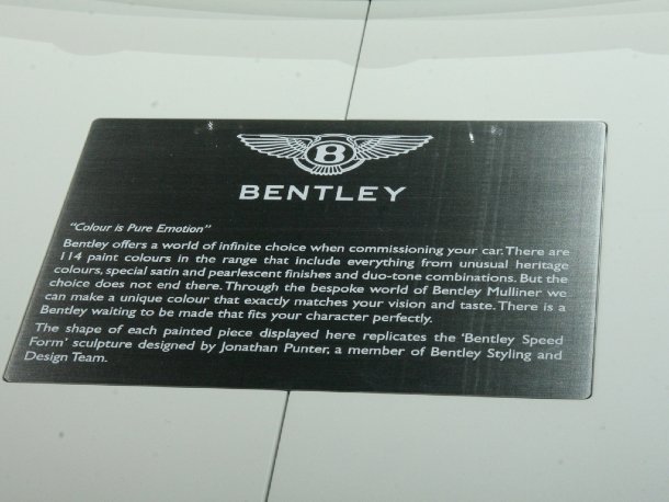 Die britische Edelmarke Bentley präsentierte den Continental Supersports erstmals in Deutschland. Dieser Wagen ist in der Lage Ethanol zu tanken, womit Bentley auf den aktuellen Ökotrend in der Automobilbranche reagiert. Daneben stand der Continental GTC Series 51, ein Sondermodell mit spezieller, dreifarbiger Innenausstattung. Star des Messestandes war aber selbstverständlich der nagelneue Mulsanne, das Flaggschiff aus Crewe. Die Individualisierungsmöglichkeiten für das ganz eigene Bentley-Unikat wurden anhand einer Regalwand und eines Farb-Beispiel-Tisches vorgestellt und umfassen eigentlich alles, was man sich vorstellen kann.