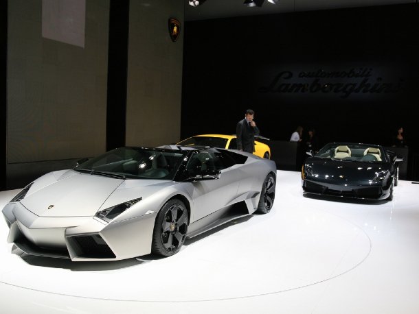 Star der Halle 3.0 war ohne Frage der Lamborghini Reventón Roadster, der sich die kleine Standfläche mit einem Gallardo LP560-4 Spyder und einem Murciélago LP670-4 SV teilte. Im oberen VIP-Bereich stand ein Gallardo LP550-2 Valentino Balboni, von dem wir leider kein Bild schießen konnten, da sich die Kamera in den unverdienten Ruhestand verabschiedete.