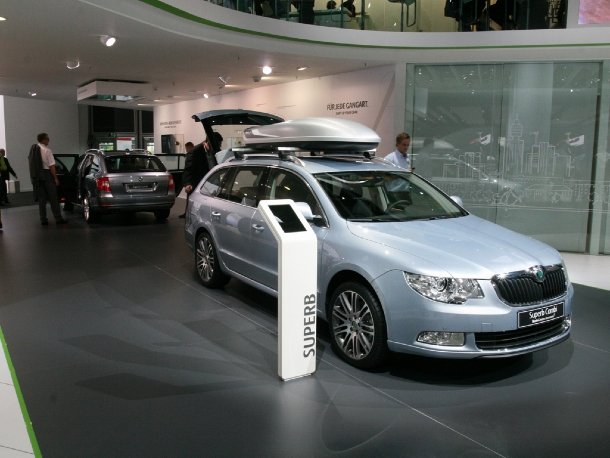 Bei Skoda stand die Premiere des Superb Combi im Mittelpunkt. Die anderen Modelle der aktuellen Palette waren ebenso vertreten, so auch ein Octavia RS und der Roomster in Zweifarblackierung.