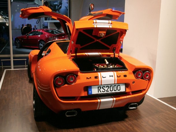 Zurück nach Deutschland, genau gesagt in den Osten. Vor vielen Jahren zu Zeiten der ehemaligen DDR gab es hier einen legendäre Sportwagen, den Melkus RS1000 auf Wartburg-Basis. Noch heute ist die Firma Melkus in Familienhand und nun ist es endlich wieder soweit: Melkus baut einen Sportwagen. Mit dem RS2000 auf Lotus Exige-Basis möchte man den Markt ein wenig bereichern. Der Flügeltürer, der optisch an den „Vorgänger“ erinnert, wird in Handarbeit und ganz nach Kundenwunsch gefertigt. Und alltaugstauglich ist er außerdem, was auf der Messe durch die obligatorische Kiste Bier im Kofferraum bewiesen wurde. Auf dem Messestand war außerdem ein auf den ersten Blick normaler RS1000 ausgestellt. Wer genau hinsah, stellte jedoch fest, dass die Aufschrift „RS1600“ lautete. Es handelt sich um ein Unikat mit Audi-1,6-Liter-Motor. Bei einem Gesamtgewicht von unter einer Tonne dürften die Fahrleistungen beeindruckend sein.