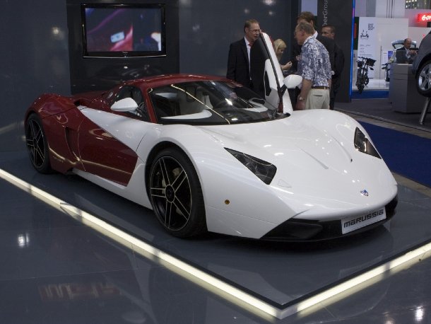 Ziemlich versteckt in einer Ecke der Halle fand sich der russische Sportwagenbauer Marussia, der neben der Prototypenversion in dunkelblau auch die ersten beiden Serienfahrzeuge in Zweifarblackierung mitgebracht hatte. Leider hält die Technik nicht, was die sportliche Optik verspricht. Wer aufgrund des geduckten sportlichen Auftritts auf Traumwerte jenseits von 500 PS gehofft hat, wird beim Blick ins Datenblatt enttäuscht: lediglich 245 PS aus einem Vierzylindermotor verrichten hier ihren Dienst. Aber wer weiß, vielleicht kauft man ja in Zukunft noch irgendwo einen V8 zu und verpasst dem Wagen die Leistung, die zur Optik passt?