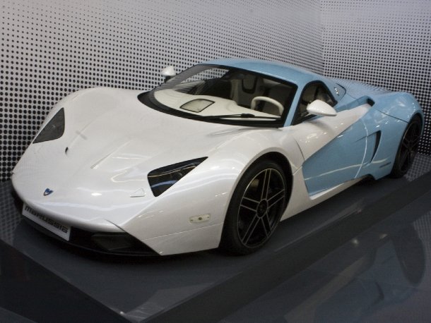 Ziemlich versteckt in einer Ecke der Halle fand sich der russische Sportwagenbauer Marussia, der neben der Prototypenversion in dunkelblau auch die ersten beiden Serienfahrzeuge in Zweifarblackierung mitgebracht hatte. Leider hält die Technik nicht, was die sportliche Optik verspricht. Wer aufgrund des geduckten sportlichen Auftritts auf Traumwerte jenseits von 500 PS gehofft hat, wird beim Blick ins Datenblatt enttäuscht: lediglich 245 PS aus einem Vierzylindermotor verrichten hier ihren Dienst. Aber wer weiß, vielleicht kauft man ja in Zukunft noch irgendwo einen V8 zu und verpasst dem Wagen die Leistung, die zur Optik passt?