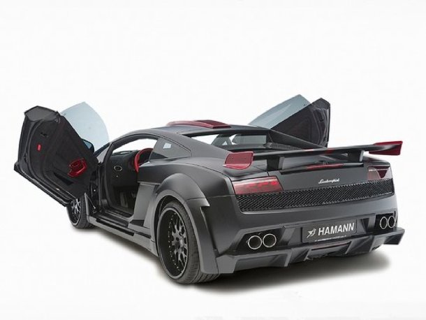 Um den Bezug zum Rennsport noch deutlicher zu machen trägt das Fahrzeug zudem eine Lufthutze über dem Fahrgastraum, die ebenfalls in rotem Sichtcarbon gehalten ist. Die vordere, originale Haube kann zudem auf Kundenwunsch mit Kohlefasern beschichtet werden. Das Fotomodell trägt dies in ebenfalls sehr auffälligem roten Carbon. Was fehlt eigentlich noch, um einem Gallardo mehr Show zu gönnen? Richtig: Flügeltüren. Auch hier hilft Hamann aus und spendiert dem Gallardo jenes Feature, welches ansonsten nur bei den 12 Zylinder-Modellen zu finden ist.