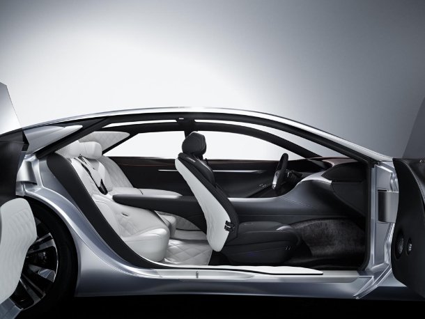 Zugunsten eines barrierefreien Einstiegs verzichteten die Designer beim Q80 Inspiration Concept auf B-Säulen zwischen den Türen. Somit wird der Blick direkt auf die optisch voneinander abgeteilten Abteile vorn und hinten gelenkt. Während Fahrer und Beifahrer auf schwarzen Ledersitzen Platz nehmen und auch das Armaturenbrett sowie das Lenkrad schwarz bezogen sind, zeigt sich der Fondbereich in edlem Weiß mit Diamantsteppung im Leder. Der Fahrerarbeitsplatz wird durch eine Reduzierung der Knöpfe und Schalter auf ein wesentliches Minimum sportlich-vereinfacht, damit man sich ganz auf das Fahrerlebnis konzentrieren kann.