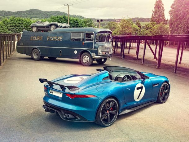 Zum Goodwood Festival of Speed präsentierte Jaguar das Project 7 Concept auf Basis des neuen F-Type. In der sportlichen Roadsterkarosserie steckt ein 550 PS starker V8-Kompressormotor, der auf die kommende R-Variante hindeutet. Anstelle eines Beifahrersitzes gibt es eine Helmablage. Hinter dem Fahrer gibt es wie in den 50ern einen Überrollbügel, der sich als Finne bis zum Heck zieht. Zusätzlich wird die Optik aerodynamisch nachgeschärft.