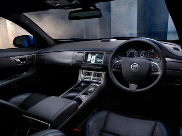 Im Interieur kommen verschiedene Lederverarbeitungstechniken zum Einsatz. Auf den Sitzpolstern und den Armauflagen in den Türverkleidungen findet sich Carbon-Leder, das mit kohleschwarzem Leder auf den restlichen Sitzflächen, Türverkleidungen, dem Lenkrad, dem Mitteltunnel und dem Armaturenbrett ergänzt wird. Farbige Kontrastnähte, wahlweise in blau, rot oder elfenbeinweiß, sorgen für optische Auflockerung. Zusätzlich wird auf die Sitzlehnen ein XFR-S Logo eingestickt. Leicht abgedunkeltes Aluminium zeigt sich rund um die Schalter und auf den Dekorblenden auf Armaturenbrett und Türen. Sollte neben dem V8-Grollen einmal Bedarf nach weiterer Musik aufkommen, sorgt die serienmäßige Meridian-Soundanlage mit 825 Watt und 18 Surround-Sound-Lautsprechern für entsprechende akustische Untermalung.