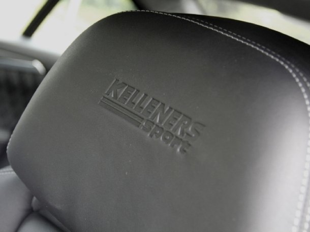 Auch an das Interieur wurde auf Gut Wiesenhof gedacht. Das schwarze Leder des Vorführwagens zeigt sich auf den Sitzen und den Türverkleidungen mit einer Rautensteppung und wird zusätzlich im gesamten Innenraum durch weiße Kontrastnähte aufgewertet. Dekorleisten in Sichtcarbon am Armaturenbrett, Lenkrad und auf der Mittelkonsole runden den sportiven Eindruck ab. In den Kopfstützen der Vordersitze ist das Kelleners Sport Logo eingeprägt.