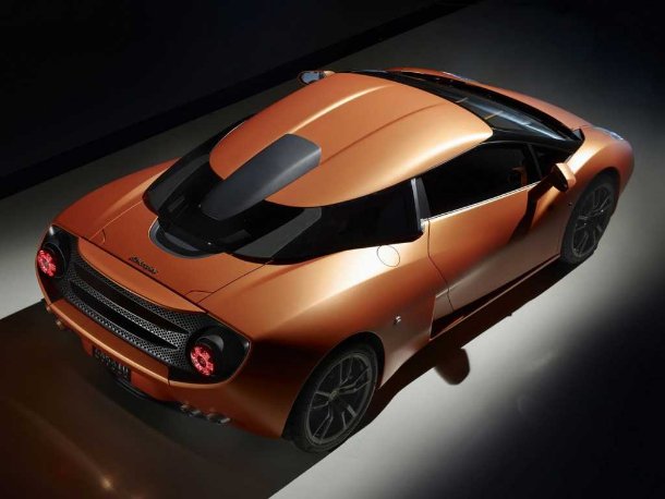 Zagato hat hier ganze Arbeit geleistet, um ein eigenständiges Design auf die Räder zu stellen. Vorn wartet ein oval ausgeformter Kühlerschlund auf den Fahrtwind, während außerhalb jeweils kleinere Einlässe, die sich bis zu den Scheinwerfern hochziehen, für die Bremsenkühlung vorgesehen sind. Unterhalb der Frontscheibe sorgt ein kleiner Flügel für Anpressdruck. Die Rundungen der vorderen Kotflügel laufen bis in die Türen hinein und bilden die Basis für die Stützen der Außenspiegel