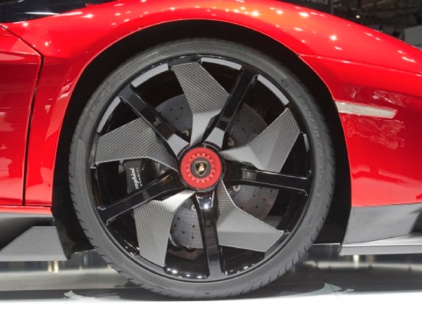 Die Räder tragen Elemente in Sichtcarbon und sind mit Zentralverschlüssen am Aventador J befestigt.