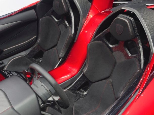 Die Carbon-Sitzschalen sind nur an den wichtigsten Stellen minimal gepolstert, wodurch der radikale Anspruch des Aventador J unterstrichen wird.