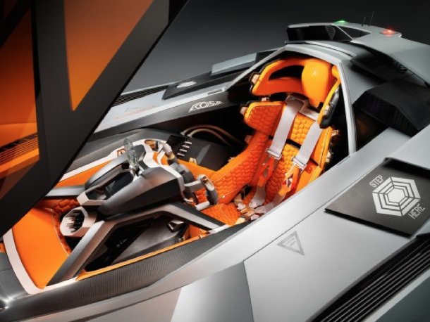 Innen ging es bei der Gestaltung vor allem um rationales Design und Funktionalität. Wenn die Glashaube elektrisch aufgeklappt ist und das Lenkrad von seiner Nabe abgenommen wurde, eröffnet sich der Einstieg, wobei man über den breiten Schweller auf den Sitz steigen muss. Der Fahrer – oder sollte man ihn Pilot nennen? – nimmt in diesem Schalensitz mit Vierpunktgurten Platz. Klassische Instrumente wurden fast vollständig durch ein Head-Up-Display ersetzt, das alle wichtigen Informationen einblendet. Es ist, im Gegensatz zu bekannten Systemen aus Serienfahrzeugen, nicht in die Windschutzscheibe eingeblendet, sondern auf eine transparente achteckige Scheibe, die oberhalb des Cockpits ausfährt.