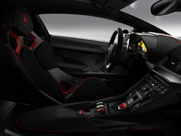 Neben der Karosserie zeigt sich auch das Interieur in Kohlefaser. Gegenüber dem Aventador werden 125 Kilogramm Leergewicht eingespart.
