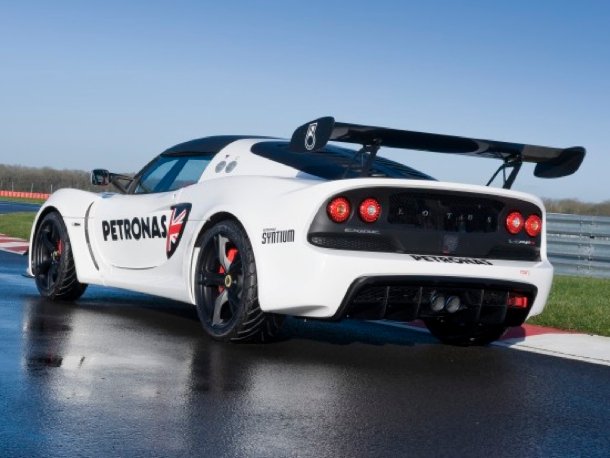 ...einem größeren Diffusor und einem breiten, einstellbaren Heckflügel. Die Beklebung mit Union Jack auf den Motorlufteinlässen und Lotus-Schriftzug auf dem Flügel ist optional erhältlich.