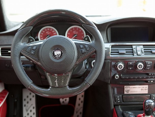 Die Jungs und Mädels bei Lumma nahmen diese außergewöhnliche Herausforderung an. Wer das Endergebnis sieht, stellt fest, dass kaum ein Teil nicht in Augenschein genommen und gegebenenfalls verbessert wurde. Das verwendete Bodykit besteht aus hochfestem und dabei superleichtem Carbon. Heckdeckel mit Abrißkante, Motorhaube mit integrierten Abluftgittern, Türgriffe, Seitenschweller, Kotflügel und sogar die Spiegelkappen bestehen aus dem teuren Werkstoff. An den Radhäusern sind Verbreiterungen angebracht worden, um Reifen im Format 255/30 (vorn) und 295/25 (hinten) auf 21 Zoll großen, dreiteiligen Leichtmetallrädern unterzubringen.