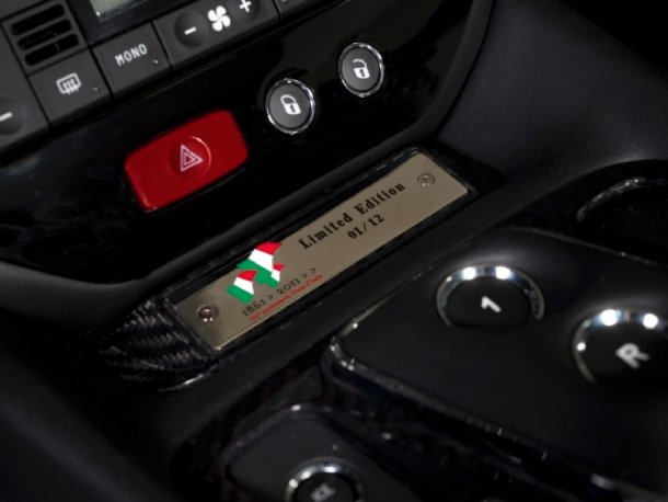 Das Interieur präsentiert sich im gewohnten Mix aus Sportivität und Eleganz. Schwarzes Leder mit weißen Kontrastnähten wird an Mittelkonsole, Türen und Armaturenbrett durch Carbon-Elemente ergänzt, die man sonst nur aus dem MC Stradale kennt. Zwischen Konsole und Instrumententräger findet sich eine Metallplakette, die auf die Feierlichkeiten zum „Centocinquantenario“, also dem 150sten Jahrestag der italienischen Unabhängigkeit hinweist und Auskunft über die Baunummer innerhalb der Limited Edition gibt.