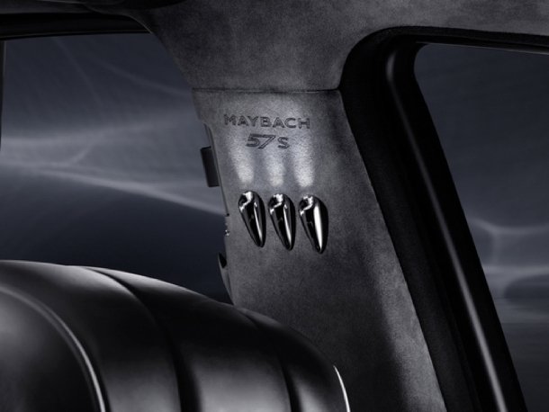 Innen erwartet die vier Maybach-Passagiere der gewohnt hochwertige Materialmix der absoluten Luxusklasse. Beim Edition 125! handelt es sich dabei um feinstes Leder, silbernes Carbon und Dekorelemente mit schwarzem Pianolack. Auf den Sitzen und in den Türverkleidungen wurde das Leder mit einer speziellen Rautensteppung mit silbernen Ziernähten veredelt und mit weißen Kedern abgesetzt. Ganz neu ist eine Konturbeleuchtung der mittleren vorderen Armlehne, bei der auf Knopfdruck die Kedern von innen weiß beleuchtet werden. Zusätzlich erscheint mittig ein Maybach-Logo, das durch das schwarze Leder scheint. Eingeschaltet wird diese neue Ambientebeleuchtung durch ein kleines Maybach-Zeichen rechts neben dem Schalthebel. Während in die Kopfstützen der vorderen Sitze das Maybach-Logo eingestickt wurde, handelt es sich bei der Stickerei auf dem Handschuhfachdeckel um die Signatur von Firmengründer Wilhelm Maybach.