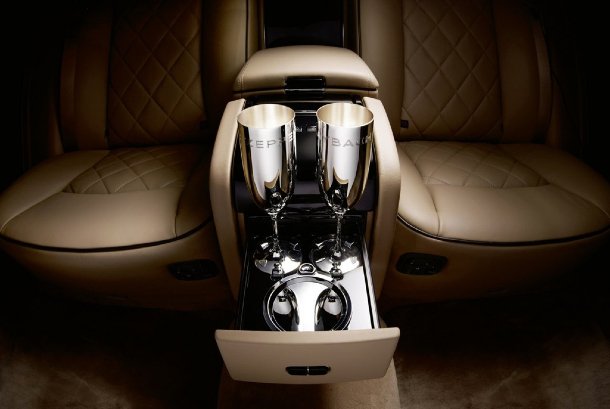Im Inneraum dominieren Leder in Kontrastfarben, sowie Klavierlack. Die abgsteppten Sitze werden durch schwarze Kedern veredelt und der Fußraum ist mit echtem Lammfell ausgelegt. Auch im Innenraum wird man sofort darauf aufmerksam gemacht, dass es sich hier um das Modell „Zeppelin“ Handelt. Schon beim Einstieg erblickt man die Gravur auf den Einstiegsleisten. Doch diese Gravur ist noch lange nicht alles. Da wären noch der Schriftzug oberhalb des Navi-Bildschirms, die Gravur auf den mitgelieferten Sektkelchen, sowie der Aufdruck „Maybach Zeppelin“ auf der optionalen Trennwand.