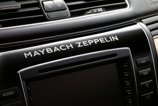 Im Inneraum dominieren Leder in Kontrastfarben, sowie Klavierlack. Die abgsteppten Sitze werden durch schwarze Kedern veredelt und der Fußraum ist mit echtem Lammfell ausgelegt. Auch im Innenraum wird man sofort darauf aufmerksam gemacht, dass es sich hier um das Modell „Zeppelin“ Handelt. Schon beim Einstieg erblickt man die Gravur auf den Einstiegsleisten. Doch diese Gravur ist noch lange nicht alles. Da wären noch der Schriftzug oberhalb des Navi-Bildschirms, die Gravur auf den mitgelieferten Sektkelchen, sowie der Aufdruck „Maybach Zeppelin“ auf der optionalen Trennwand.