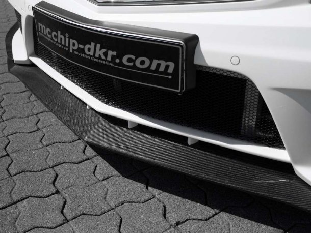 Neben dem bereits angesprochenen Facelift auf die neueren Scheinwerfer beließ mcchip-dkr an der Karosserie der C 63 AMG Limousine wenig beim Original. Alle vier Kotflügel wurden mit Carbon-Anbauteilen verbreitert. Dazu wurde ein Bodykit mit Schürzen, Schwellern und Motorhaube im Stil des C 63 AMG Coupé Black Series verbaut. Alle verbauten Teile inklusive der Außenspiegelkappen, Aero-Flics, Frontsplitter und Heckdiffusor bestehen aus Kohlefaser.