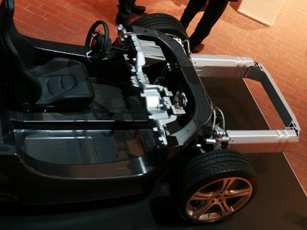 Das Chassis an sich ist eine Carbon-Monocell, die rund um die Besatzung geplant wurde. Hinten schließt sich der Motorrahmen an, an dem auch die Hinterradaufhängung angebracht ist. Vorn ist die Crashstruktur angeschraubt. Alles ist auf Leichtgewicht aufgebaut und so verwundern auch minimale Details nicht: Im Armaturenträger findet man einen McLaren-Schriftzug, der ursprünglich erhaben geplant war. Durch Simulation am PC konnte man jedoch herausfinden, dass man mit einem eingravierten Schriftzug rund 200 Gramm Gewicht problemlos einsparen kann. Klingt wenig, macht aber in Summe mit vielen weiteren Details den Unterschied. Immerhin wiegt der McLaren MP4-12C trocken nur 1.300 Kilogramm.